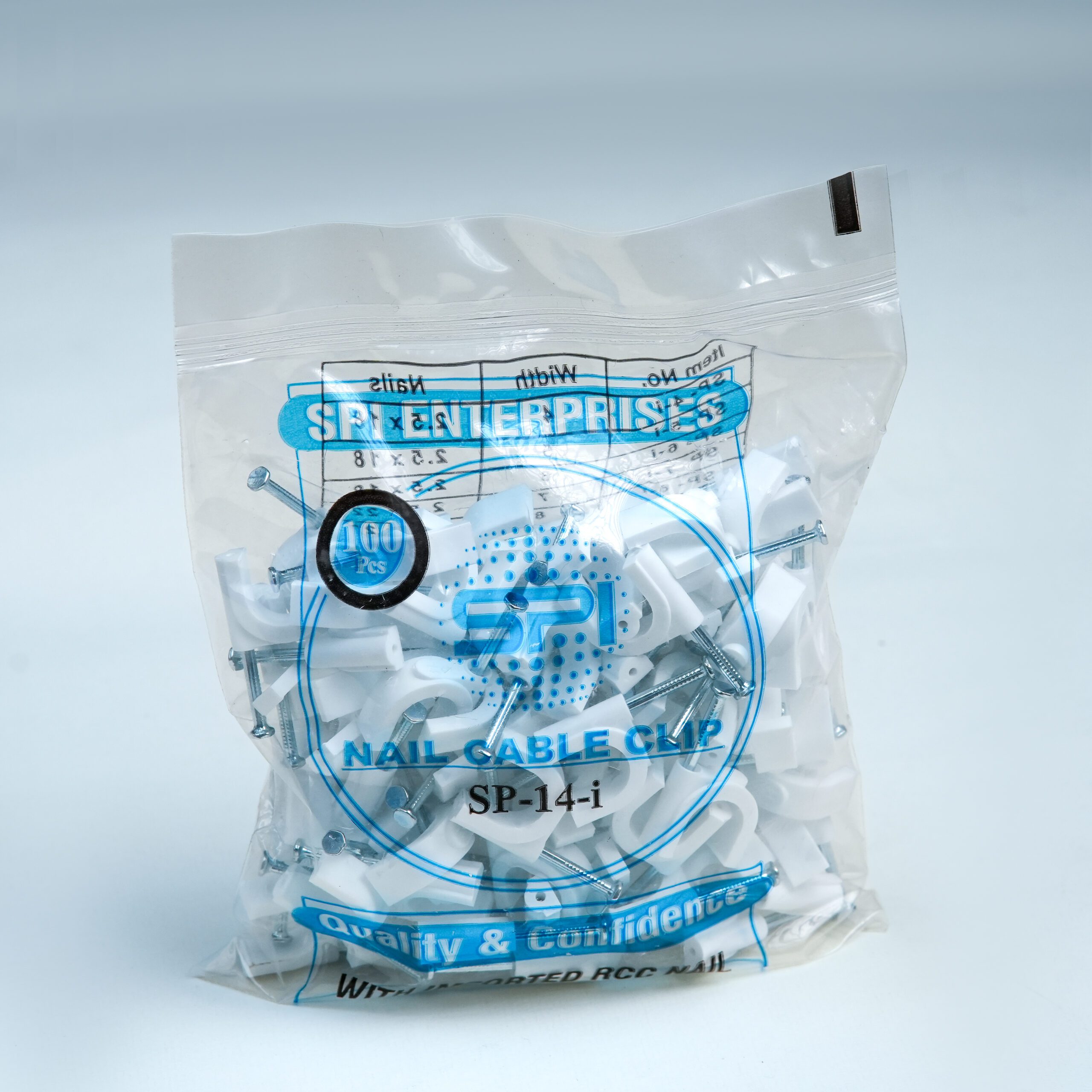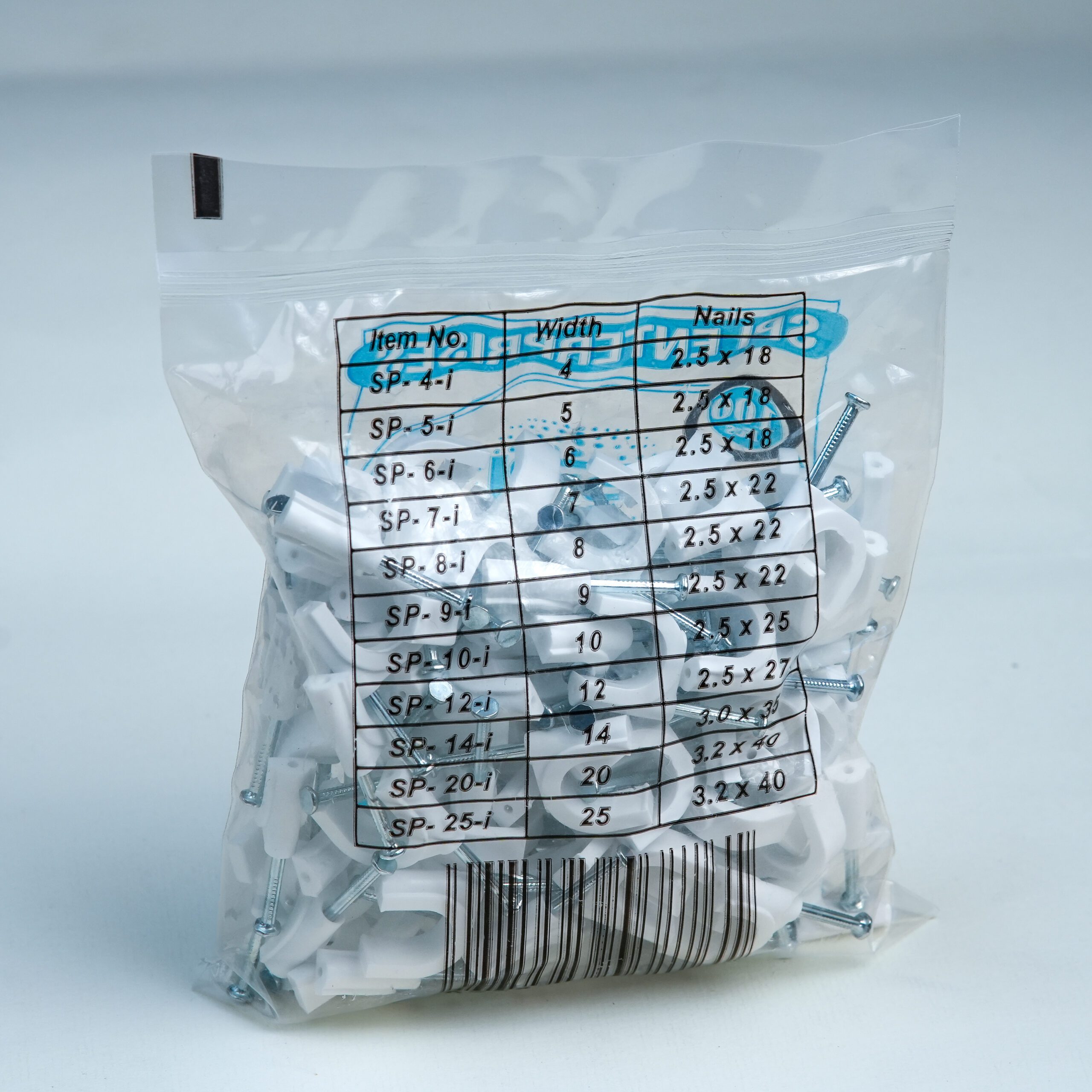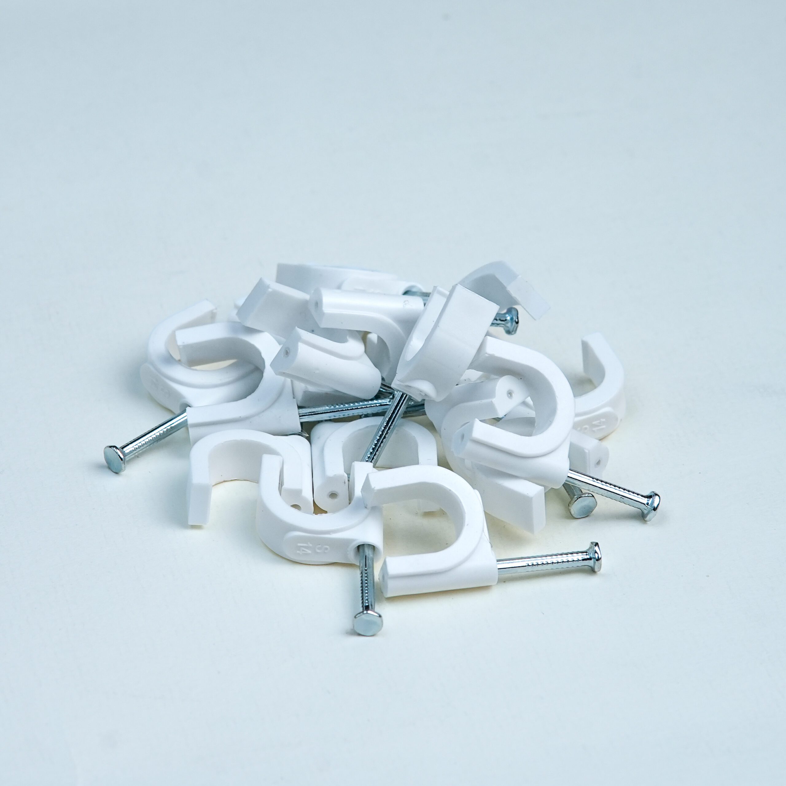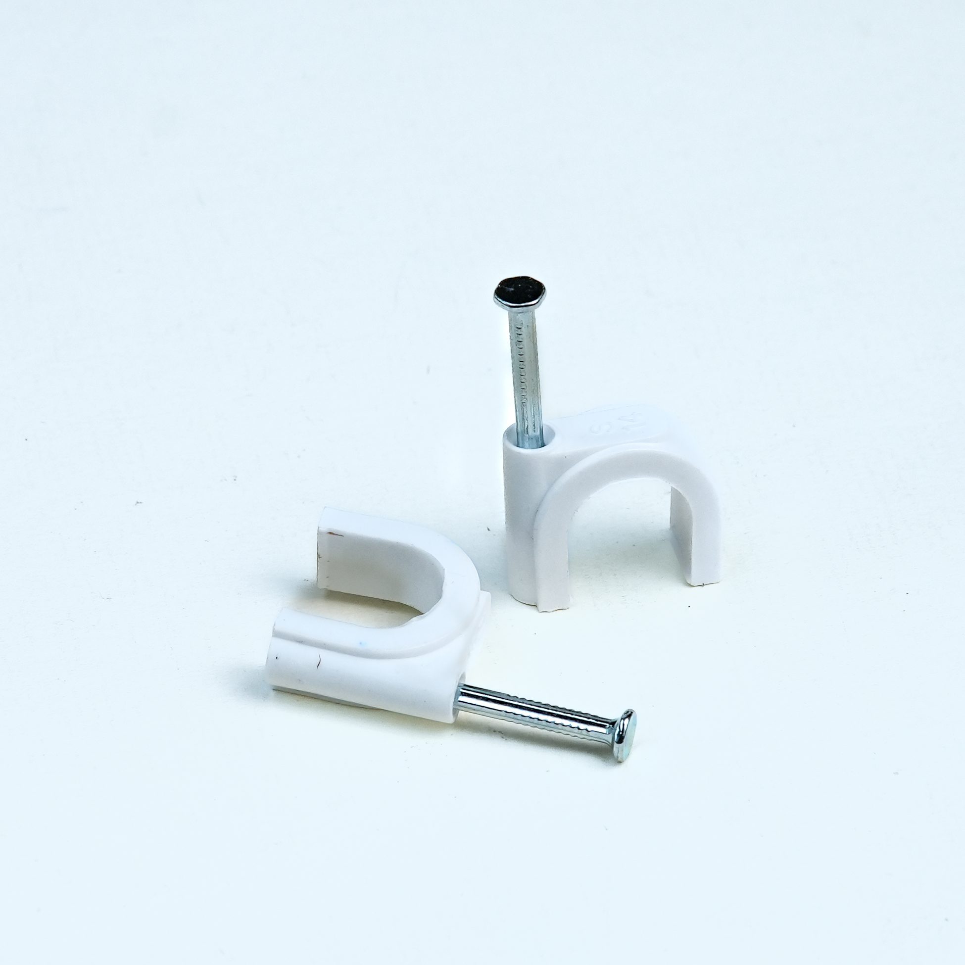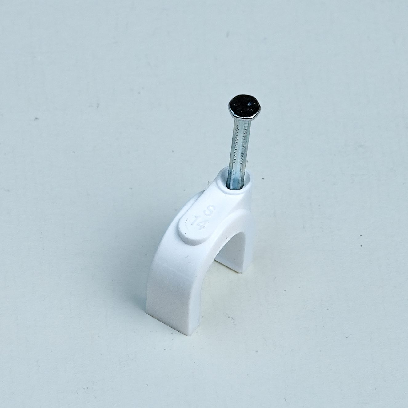 High-quality 14MM PVC cable clip designed for secure, neat, and long-lasting fixing of Heavy twin-core cable electrical wires on walls and ceilings, available with multiple nail size options.
