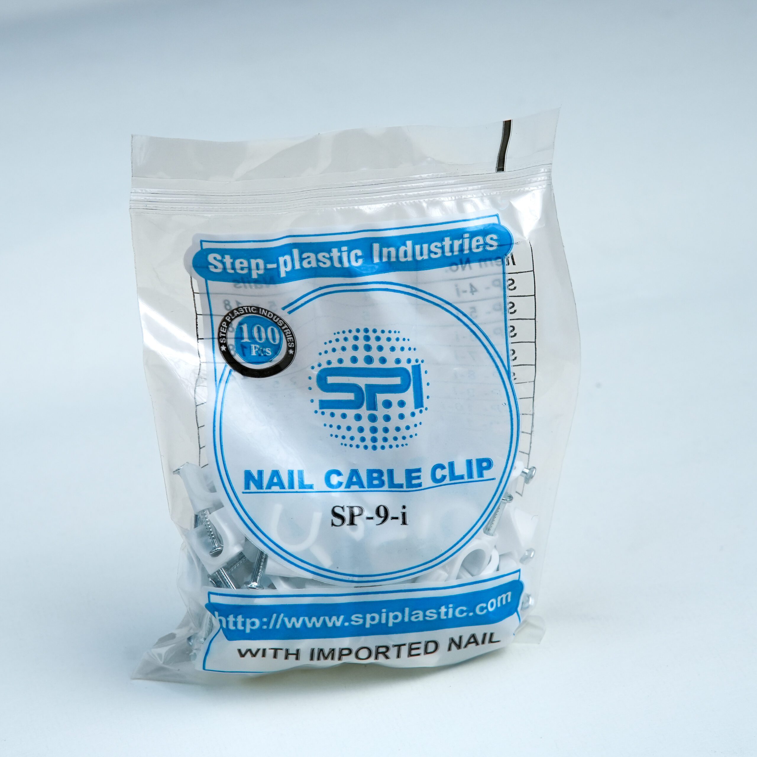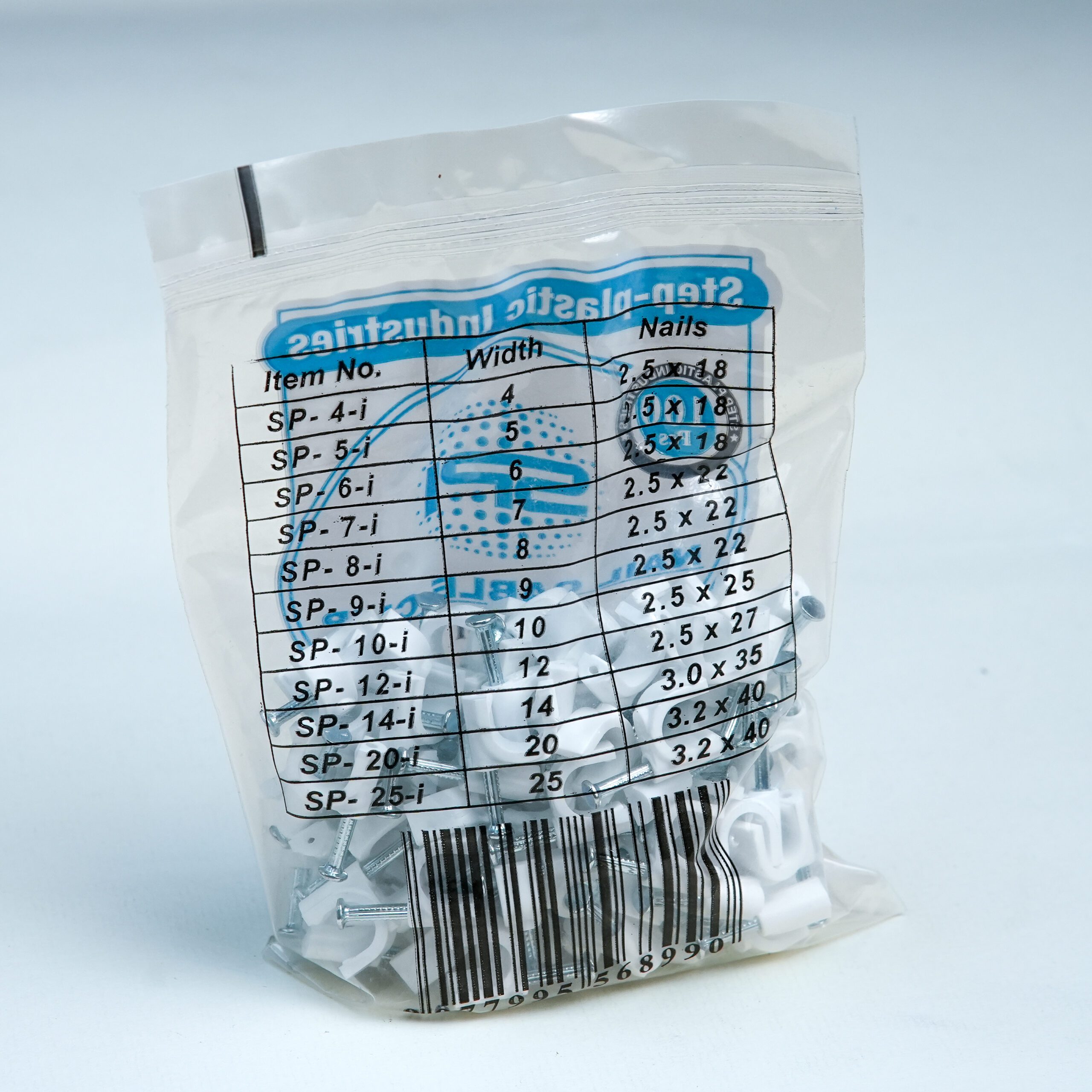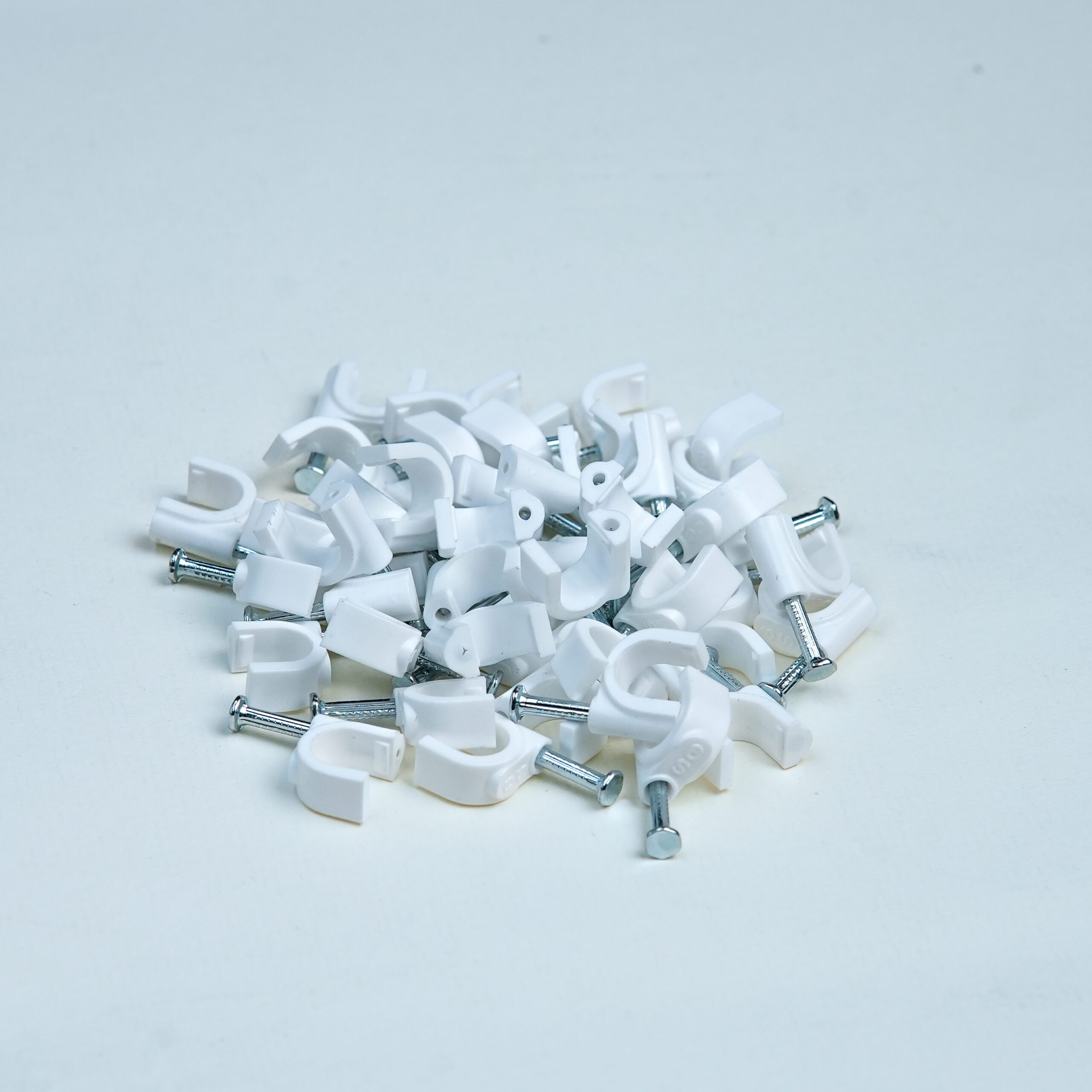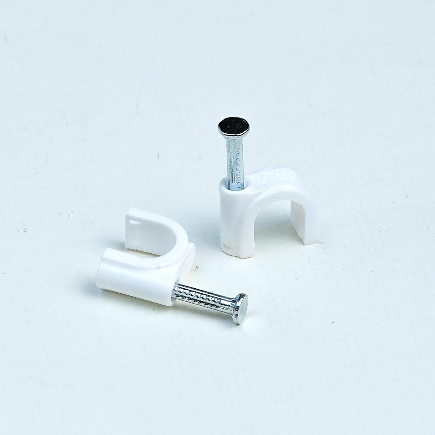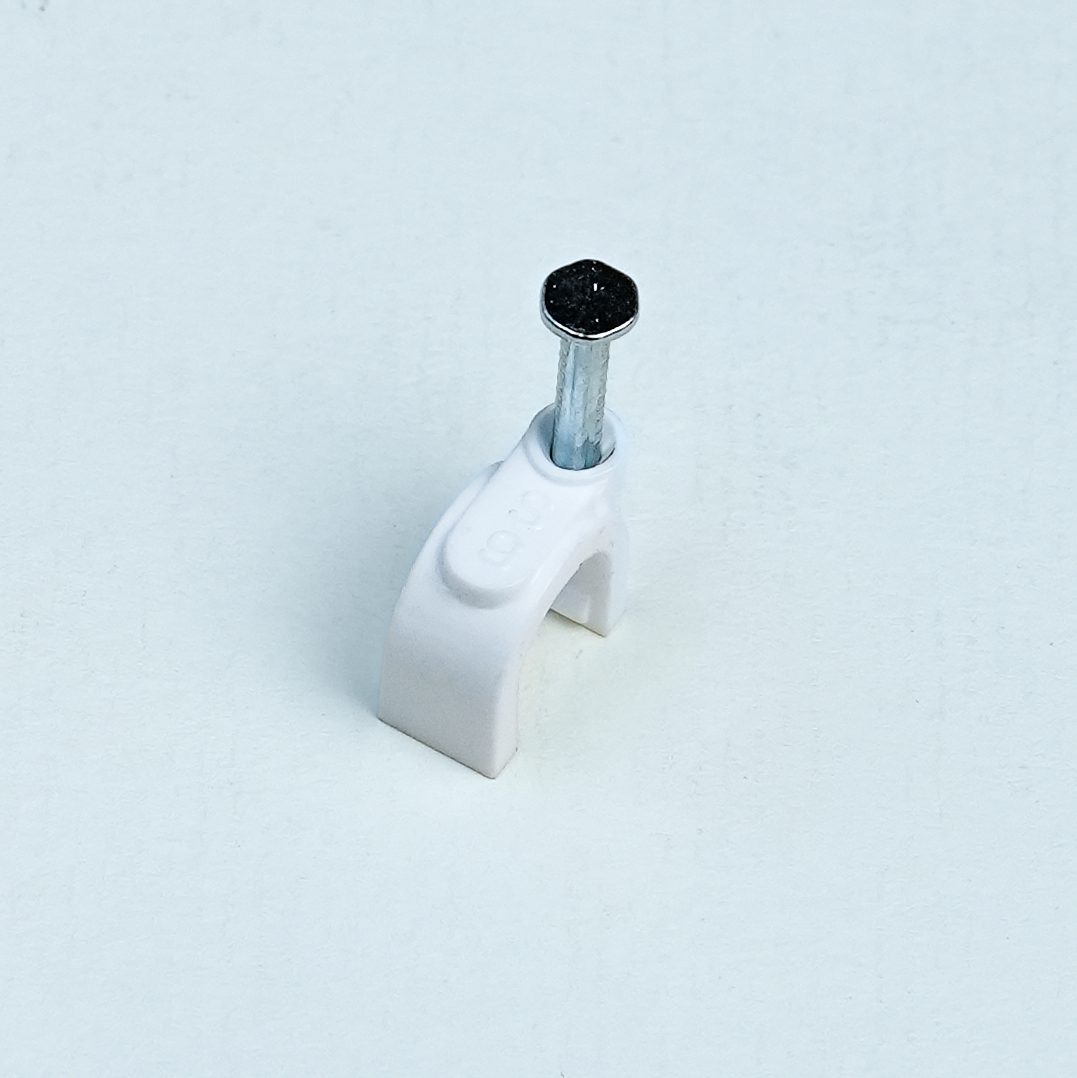 High-quality 9MM PVC cable clip designed for secure, neat, and long-lasting fixing of 3-core flexible cable electrical wires on walls and ceilings, available with multiple nail size options.